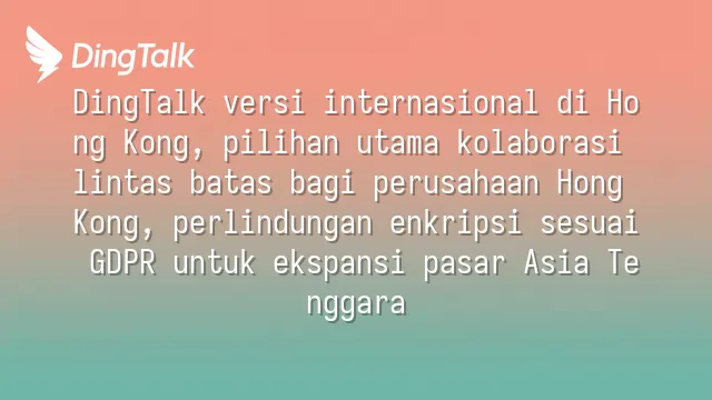 DingTalk International Hong Kong adalah platform kolaborasi perusahaan yang diluncurkan oleh Alibaba Group untuk pasar global, dirancang khusus guna memenuhi kebutuhan perusahaan multinasional dalam aspek kepatuhan data, komunikasi multibahasa, serta skenario kerja hybrid. Arsitektur platform ini mengikuti standar keamanan informasi internasional, mendukung perusahaan di Hong Kong dan Asia Tenggara dalam mewujudkan kolaborasi lintas batas negara dan transformasi digital secara aman.