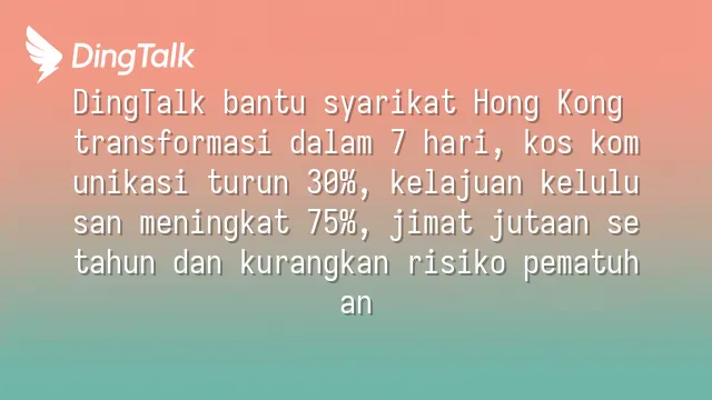 Semakin banyak syarikat Hong Kong beralih kepada DingTalk untuk menyatukan komunikasi dan pengurusan aliran kerja. Penggunaan sebenar menunjukkan penjimatan 30% masa pentadbiran, serta menyelesaikan masalah pecahan maklumat. ...
