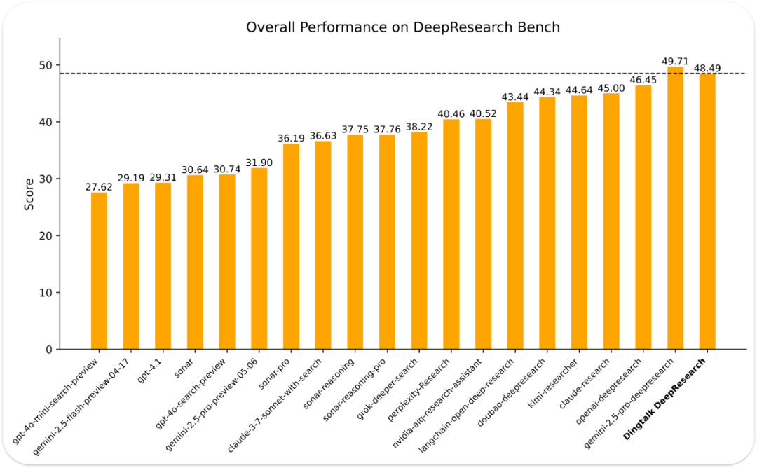 Recently, the "Dingtalk-DeepResearch" system, developed by the DingTalk team, has achieved a breakthrough result in an international authoritative evaluation, ranking second globally and first domestically on the DeepResearch Bench with a score of 48.49, surpassing mainstream systems such as OpenAI and Claude.