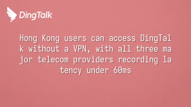 Hong Kong users can access DingTalk without a VPN, with all three major telecom providers recording latency under 60ms
