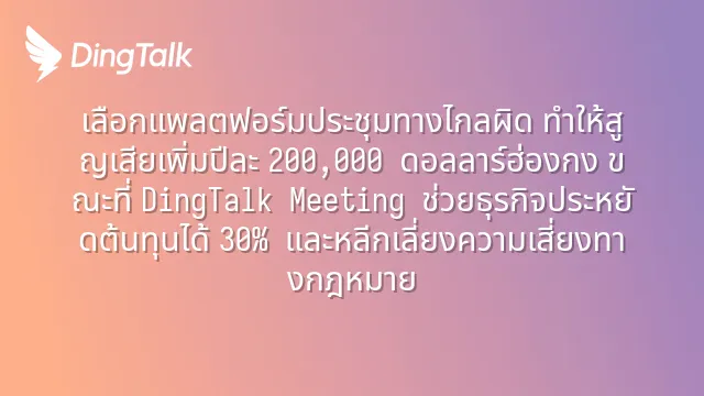 เลือกแพลตฟอร์มประชุมทางไกลผิด ทำให้สูญเสียเพิ่มปีละ 200,000 ดอลลาร์ฮ่องกง ขณะที่ DingTalk Meeting ช่วยธุรกิจประหยัดต้นทุนได้ 30% และหลีกเลี่ยงความเสี่ยงทางกฎหมาย