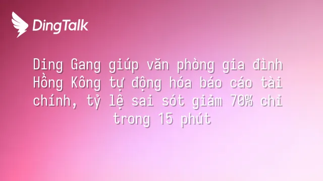 Văn phòng gia đình tại Hồng Kông đang sử dụng DingTalk để tự động hóa báo cáo tài chính, chìa khóa nằm ở khả năng tích hợp động cơ dòng công việc và môi trường phát triển mã thấp, cho phép các giám đốc tài chính không chuyên về công nghệ tự xây dựng hệ thống báo cáo tuân thủ, có thể tái sử dụng. Trước những vấn đề quản lý như tổng hợp thủ công dễ sai, cộng tác liên phòng ban chậm trễ, DingTalk giảm thiểu rủi ro can thiệp con người nhờ chuẩn hóa đầu vào dữ liệu và kích hoạt quy trình tự động.
