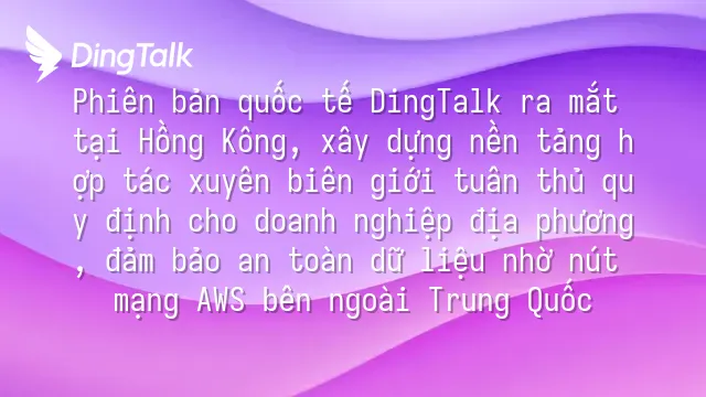 Phiên bản quốc tế DingTalk ra mắt tại Hồng Kông, xây dựng nền tảng hợp tác xuyên biên giới tuân thủ quy định cho doanh nghiệp địa phương, đảm bảo an toàn dữ liệu nhờ nút mạng AWS bên ngoài Trung Quốc