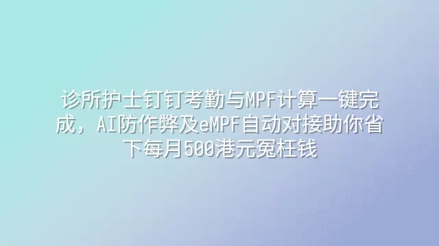 随着银联信托(BCT)与友邦(AIA)分别于2025年8月及9月接入积金易eMPF平台,诊所只剩不到三个月的转换窗口。目前仅有30%医疗机构完成系统对接测试,滞后者将面临供款延误与合规风险。要真正实现诊所护士钉钉考勤与MPF计算协同运作,必须完成三大动作:第一,验证钉钉系统能否自动提取轮班津贴、加班费等合资格收入;第二,确认数据可即时推送至eMPF平台,避免平均7.2天的延迟;第三,检查是否符合条例第418条规定的60日内完成供款的要求,特别是遣散费重算机制。此外,eMPF费用监管条款将于11月生效,涉及供款结构调整。与其等到最后一刻才临时应对,不如从今天起打通“打卡→考勤→薪酬→MPF”全链条,做到指尖一按,退休保障稳如泰山。