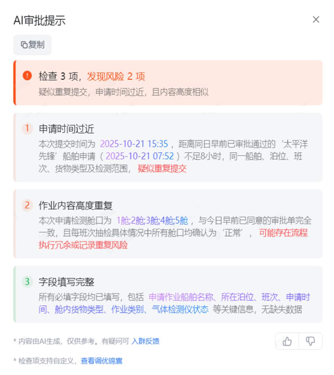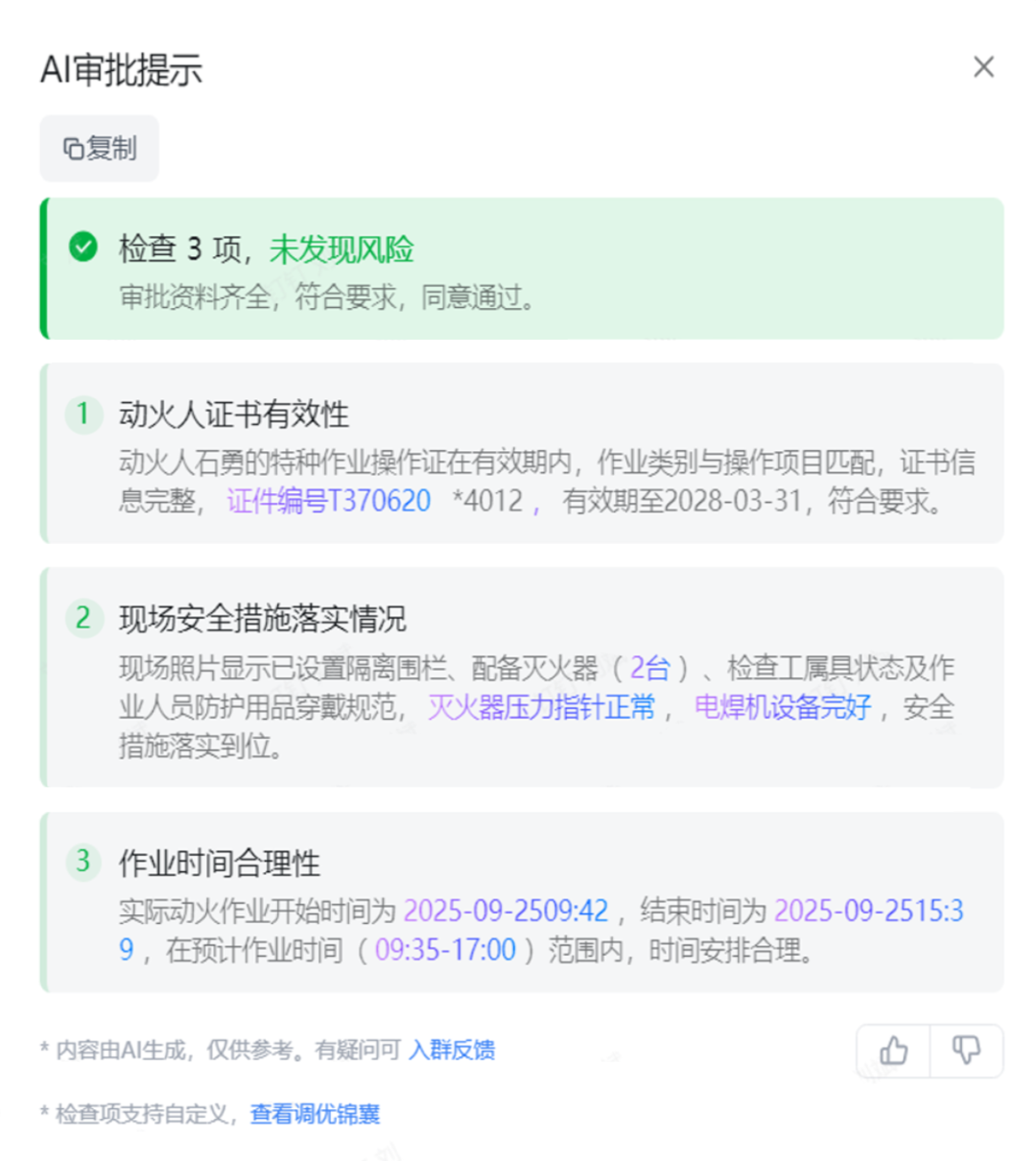 Pada pukul 08.56, pihak penyetuju pengelasan panas Feng Wenfeng memverifikasi setiap foto yang dikirim oleh Li Haiqing. Setelah memastikan semuanya benar, ia menekan tombol “Setuju”, sekaligus mengirimkan salinan kepada para manajer terkait. Pada pukul 15.24, Li Haiqing menyelesaikan inspeksi rutin dan mengunggah foto lokasi; pada pukul 16.14 dan 16.28, ia masing-masing menyelesaikan penerimaan pasca-operasi, konfirmasi keberangkatan aman personel, dan inspeksi kedua setelah pekerjaan selesai. Pada pukul 18.16 dan 18.18, pengawas kualitas proses Liu Hao dan wakil kapten tim Feng Chengwei secara berturut-turut memberikan persetujuan daring, dengan catatan khusus: “Waktu inspeksi kedua harus distandarkan.”