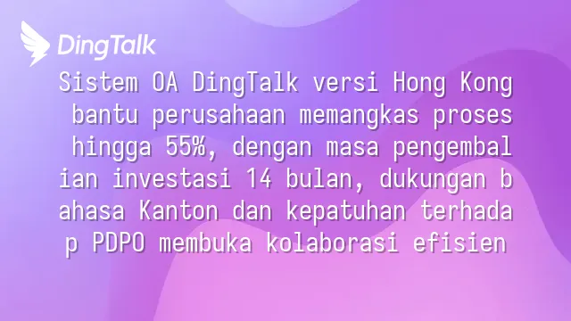 Sistem OA DingTalk versi Hong Kong bantu perusahaan memangkas proses hingga 55%, dengan masa pengembalian investasi 14 bulan, dukungan bahasa Kanton dan kepatuhan terhadap PDPO membuka kolaborasi efisien