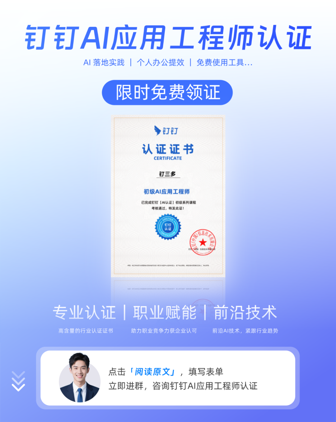 Sistem pensijilan "Jurutera Aplikasi AI" dibahagikan kepada tiga peringkat—permulaan, pertengahan dan lanjutan—dan menyediakan latihan AI sistematik untuk pekerja dari pelbagai jawatan syarikat seperti pengeluaran, perniagaan, pembelian, penyelidikan, sumber manusia, kewangan dan undang-undang. Individu boleh menguasai kemahiran aplikasi AI dengan cepat melalui pembelajaran, menjadi tenaga kerja pelbagai fungsi yang "faham perniagaan + mahir AI + mampu melaksanakan".