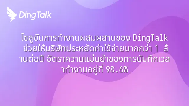 โซลูชันการทำงานผสมผสานของ DingTalk ช่วยให้บริษัทประหยัดค่าใช้จ่ายมากกว่า 1 ล้านต่อปี อัตราความแม่นยำของการบันทึกเวลาทำงานอยู่ที่ 98.6%