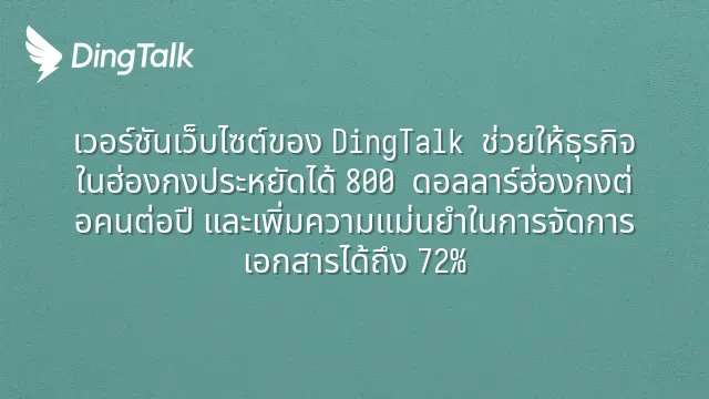 เวอร์ชันเว็บไซต์ของ DingTalk ช่วยให้ธุรกิจในฮ่องกงประหยัดได้ 800 ดอลลาร์ฮ่องกงต่อคนต่อปี และเพิ่มความแม่นยำในการจัดการเอกสารได้ถึง 72%
