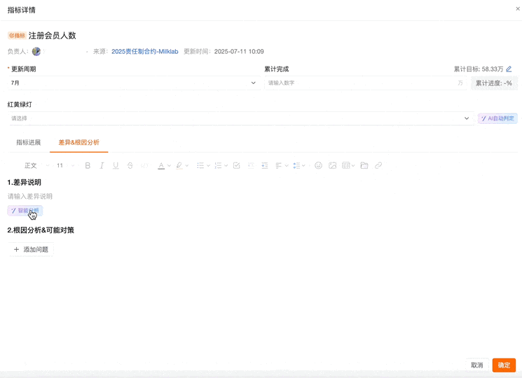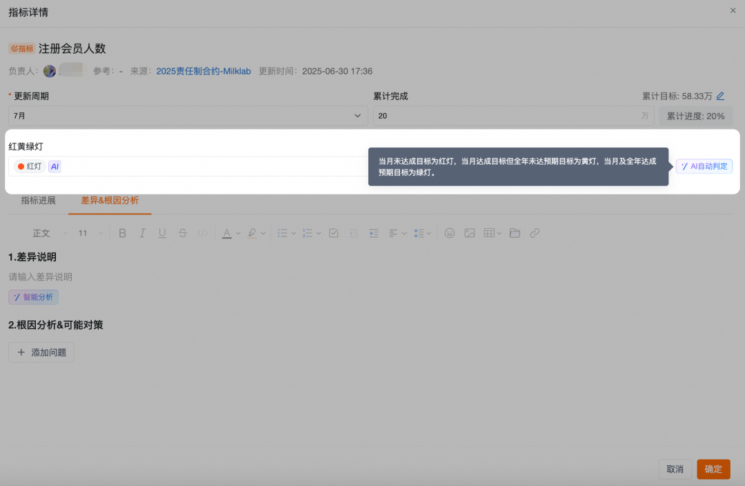指标达成是否符合预期,AI会自动判定红黄绿灯状态