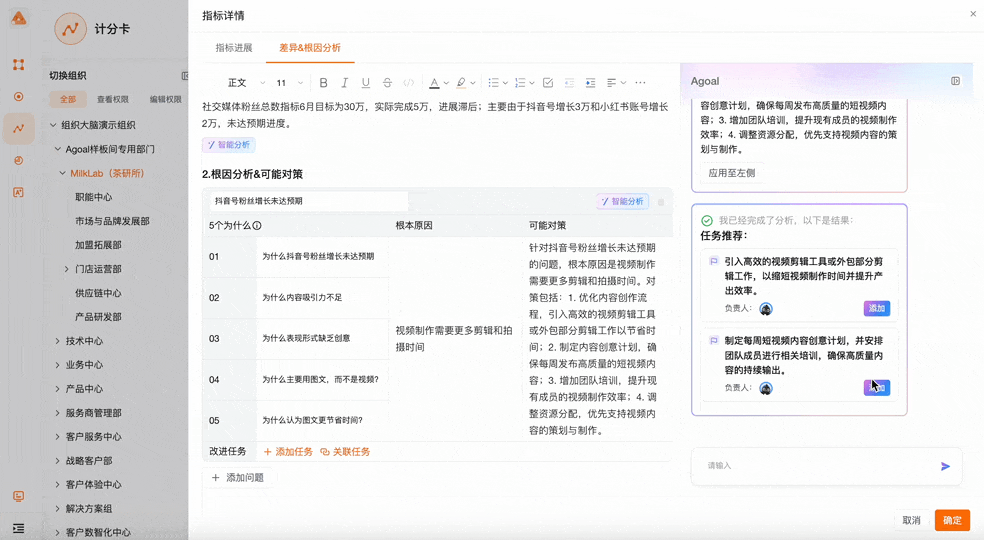 Agoal AI的5WHY根因分析是重要的会议工具。比如,当营销部门提出“注册会员人数”未达预期时,AI会引导式提问:为什么注册会员人数未达预期?为什么新店注册率低?为什么推广活动效果不好?为什么目标客户触达率不足?为什么渠道选择有偏差?通过层层深入的提问,帮助团队找到影响业务达成的最关键因素,实现了从表面现象到根本原因的深度挖掘。