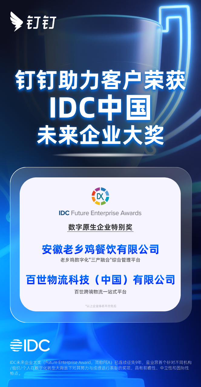 近日,国际数据公司(IDC)正式公布“2025 IDC中国未来企业大奖”优秀奖获奖名单。钉钉助力老乡鸡打造的“数字化三产融合综合管理平台”以及与百世集团共建的“百世跨境物流一站式平台”,从众多参评项目中脱颖而出,双双荣获“数字原生企业特别奖”。