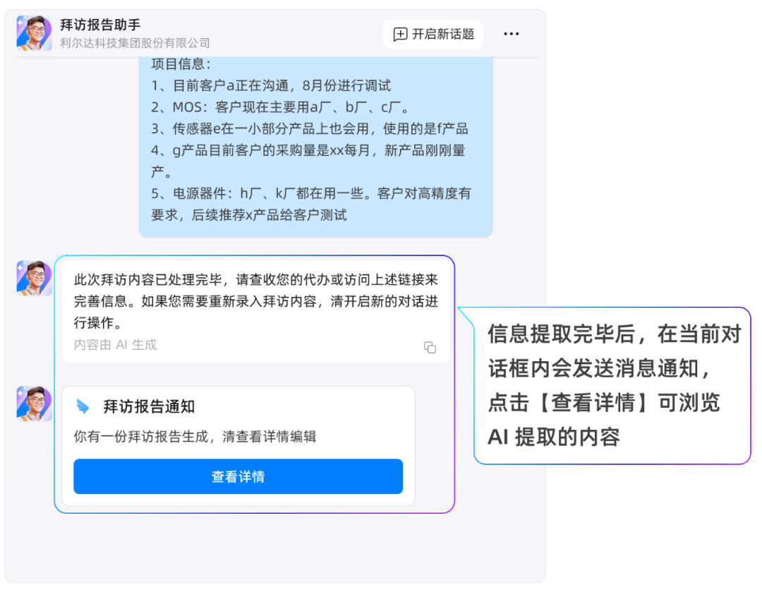 为此,利尔达在钉钉上搭建AI助理。销售人员在访问结束后,可随时通过语音与AI对话,自然语言复述过程,AI即自动解析并生成结构化访问报告。