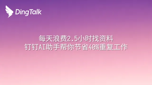 每天浪费2.5小时找资料?钉钉智慧办公通过AI助手与自动化流程,将重复工作减少40%。释放团队潜能,让决策快人一步。